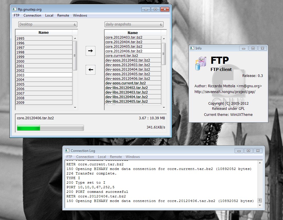 FTP is a file transfer application (RFC 765) featuring a compact and easy interface. As most applications in GAP it tries to work on both GNUstep and MacOS X and retain the utmost possible simlilarity among the two version to ease working in both environments.